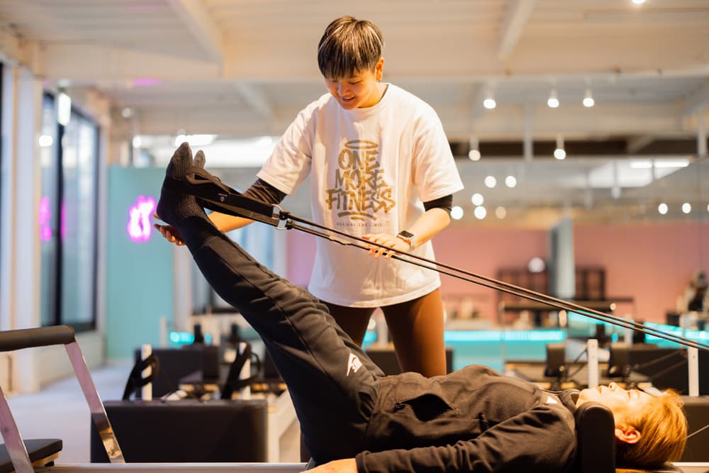 Pilates.∞ではマシンピラティス(リフォーマー)を中心とした指導を行い、姿勢改善やボディメイクを得意としています。